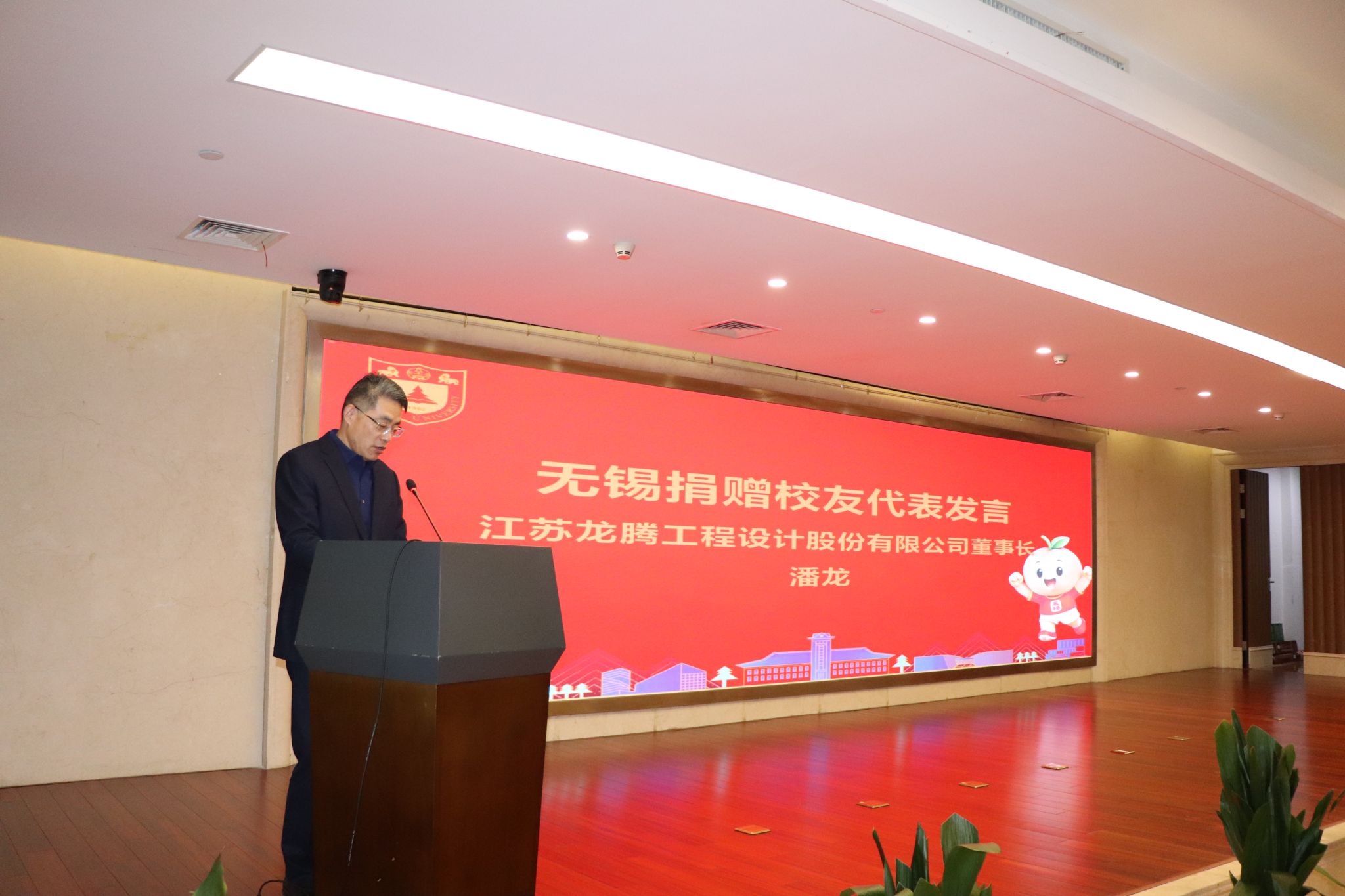 捐赠校友代表、江苏龙腾工程设计股份有限公司董事长潘龙表示,“嚼得菜根、做得大事”的处事准则已深深融入一代代人的血脉,成为大家投身公益、服务社会的精神源头。他愿这份涓滴善举,成为照亮受赠学子人生之路的希望之光,成为推动母校持续发展进步积极而温暖的一份微薄力量。