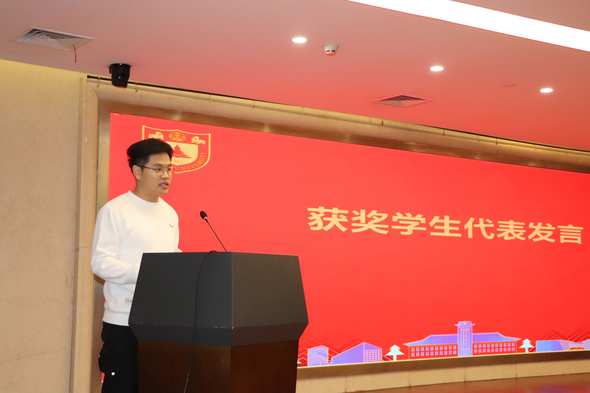 获奖学生代表、大学物理学院2023级博士生陈景衡发言感谢学长们雪中送炭的温暖与真情,他表示,这份爱心捐助不仅解了自己生活上的燃眉之急,更是一堂最生动的人文课。他希望自己日后能够在资助贫困学生的工作中尽一份绵薄之力。